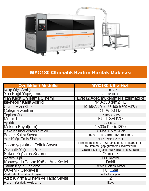 MYC180, yüksek hız ve maksimum verimlilik için tasarlanmış tam otomatik bir karton bardak üretim makinesidir. Tüm aktarma sistemleri 7 adet Servo motor ile kontrol edilen yapısı, sıcak hava üflemeli güçlü taban yapıştırma sistemi ve güçlendirilmiş şasesiyle mükemmel sızdırmazlık ve stabil üretim sağlar. Çift Ön ısıtma sistemiyle Dakikada stabil 140-160 adet üretim kapasitesiyle endüstriyel ölçekte kesintisiz ve güvenli üretim sunar.